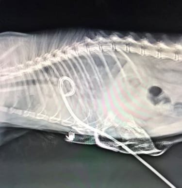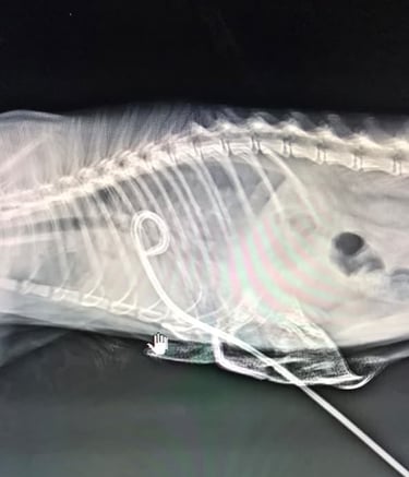 Our veterinary team employed a pig-tail catheter in the pleural cavity for continuous drainage under sedation and anesthesia. This approach allowed controlled and gentle removal of the infection, helping Mango breathe comfortably and recover steadily.