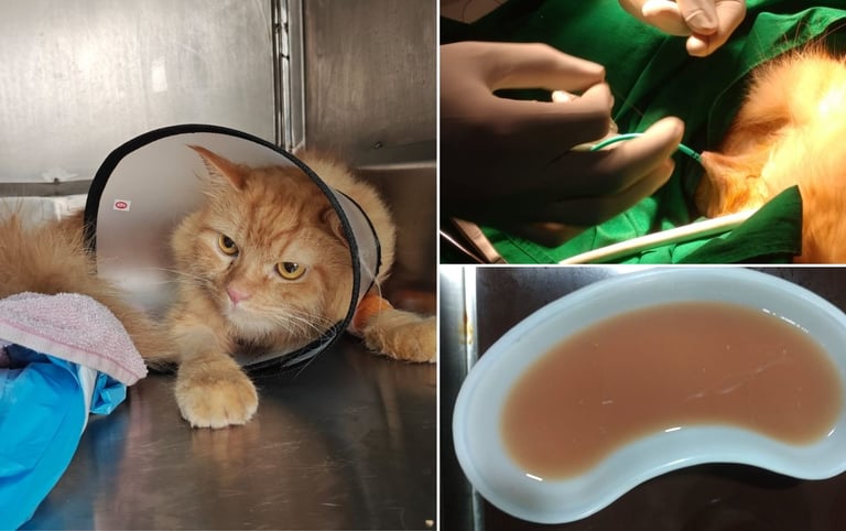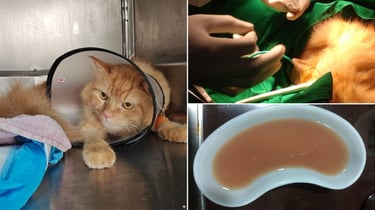 Mango, a 2-year-old Persian cat, was brought to Soulmates Vet Hospital presenting with rapid and labored breathingInvestigations, including X-ray and ultrasound, revealed a severe pyothorax — a collection of pus and fluid in the chest cavity. Despite repeated aspirations of over 250 ml each time, the fluid continued to accumulate, indicating the need for a more advanced intervention. Our veterinary team employed a pig-tail catheter in the pleural cavity for continuous drainage under sedation and anesthesia. This approach allowed controlled and gentle removal of the infection...